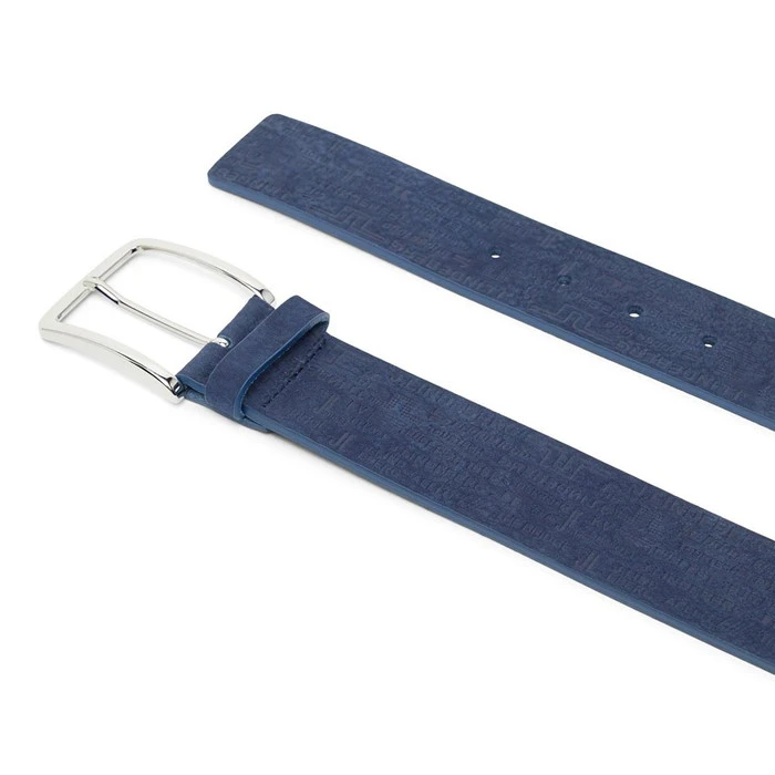 Leather belt with an embossed all-over print artwork and contrast color edge.